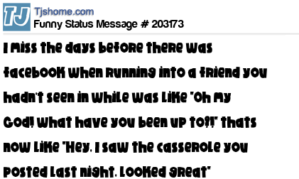 - # 203174 I miss the days before there was facebook when running into a friend you hadn't seen in while was like "Oh my God! what have you been up to?!" thats now like "Hey, I saw the casserole you posted last night, looked great"