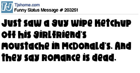 - # 65515 I just saw a guy wipe ketchup off his girlfriend's moustache in McDonald's. And they say romance is dead.