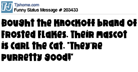 X says Bought the knockoff brand of Frosted Flakes. Their mascot is Carl the Cat. "They're purretty good!"