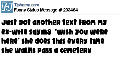 - # 208893 My ex just texted me, "Wish you were here". She does that every time she walks through a cemetery.