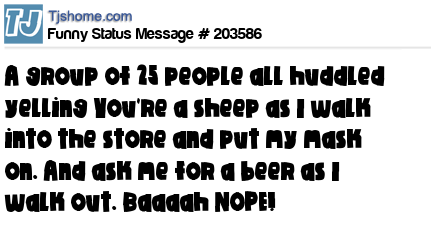 X says A group of 25 people all huddled yelling You're a sheep as I walk into the store and put my mask on. And ask me for a beer as I walk out. Baaaah NOPE!