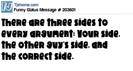 X says There are three sides to every argument: Your side, the other guy's side, and the correct side.