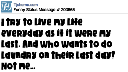 - # 141462 I try to live each day like it's my last, which is why I don't have any clean laundry b/c hey, who wants to do laundry on the last day of their lives??