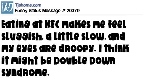 X Eating at KFC makes me feel sluggish, a little slow, and my eyes are droopy. I think it might be Double Down syndrome.