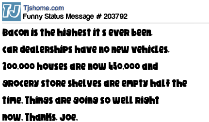 X says Bacon is the highest it’s ever been, car dealerships have no new vehicles, 200,000 houses are now 450,000 and grocery store shelves are empty half the time. Things are going so well right now. Thanks, Joe.
