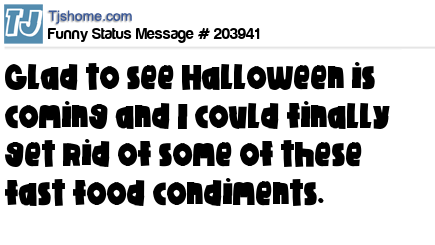 - # 197866 Just remembered that it's Halloween and won't be getting any trick-or-treaters this year, which is all good as I might need my fast food condiments to help survive the Coronavirus.