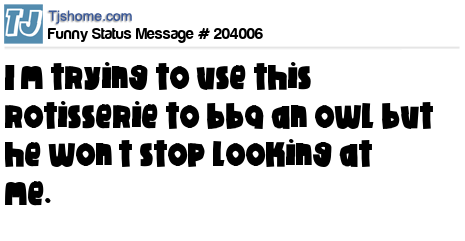 X says I’m trying to use this rotisserie to bbq an owl but he won’t stop looking at me.