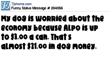 X says My dog is worried about the economy because Alpo is up to $3.00 a can. That’s almost $21.00 in dog money.