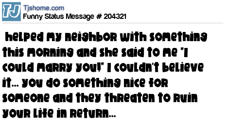 X says helped my neighbor with something this morning and she said to me "I could marry you!" I couldn't believe it... you do something nice for someone and they threaten to ruin your life in return...
