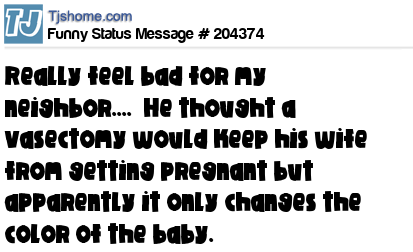 - # 196681 Really feel bad for my neighbor.... He thought a vasectomy would keep his wife from getting pregnant but apparently it only changes the color of the baby.