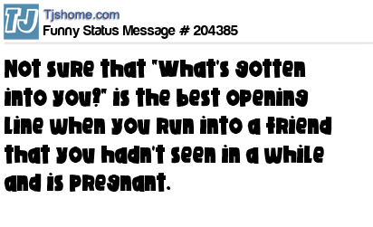 X says Not sure that "What's gotten into you?" is the best opening line when you run into a friend that you hadn't seen in a while and is pregnant.