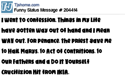 X says I went to confession. Things in my life have gotten way out of hand and I mean WAY out. For penance, the priest gave me 10 Hail Marys, 10 Act of Contritions, 10 Our Fathers and a Do It Yourself Crucifixion kit from IKEA.