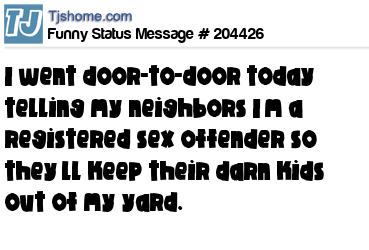 - # 107212 I went door-to-door today telling my neighbors I'm a registered sex offender so they'll keep their damn kids out of my yard.