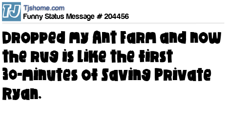 X says Dropped my Ant Farm and now the rug is like the first 30-minutes of Saving Private Ryan.