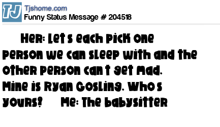 X says Her: Let’s each pick one person we can sleep with and the other person can’t get mad. Mine is Ryan Gosling. Who’s yours? Me: The babysitter