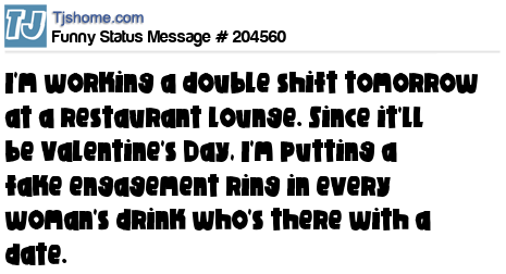 X says I'm working a double shift tomorrow at a restaurant lounge. Since it'll be Valentine's Day, I'm putting a fake engagement ring in every woman's drink who's there with a date.