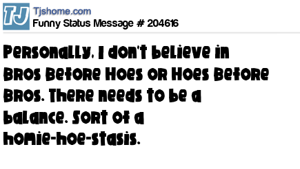 - # 164610 Personally, I don't believe in Bros Before Hoes or Hoes Before Bros. There needs to be a balance. A homie-hoe-stasis, if you will.