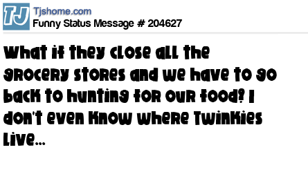 X says What if they close all the grocery stores and we have to go back to hunting for our food? I don't even know where Twinkies live...
