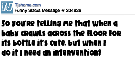 X says So you're telling me that when a baby crawls across the floor for its bottle it's cute, but when I do it I need an intervention?
