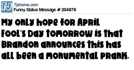 X says My only hope for April Fool's Day tomorrow is that Brandon announces this has all been a monumental prank.