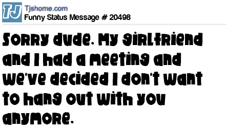 X Sorry dude. My girlfriend and I had a meeting and we've decided I don't want to hang out with you anymore.