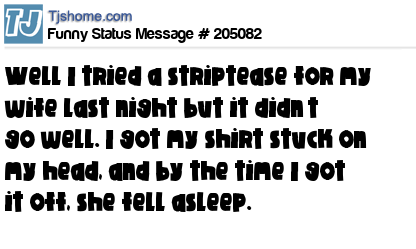 - # 205387 tried a striptease for my wife last night but it didn’t go well. I got my shirt stuck on my head, and by the time I got it off, she had left the room.