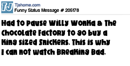 - # 209112 Paused Willy Wonka and The Chocolate Factory to go buy a Snickers. This is why I can’t watch Breaking Bad.