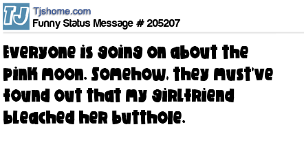 X says Everyone is going on about the pink moon. Somehow, they must've found out that my girlfriend bleached her butthoIe.