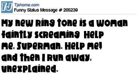 - # 118161 My ring tone is a woman faintly screaming 'Help me, Superman. Help me!' and then I run away, unexplained.