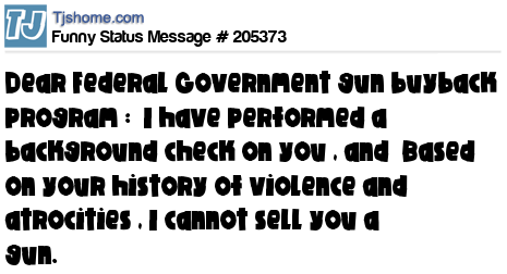 X says Dear Federal Government gun buyback program : I have performed a background check on you , and Based on your history of violence and atrocities , I cannot sell you a gun.