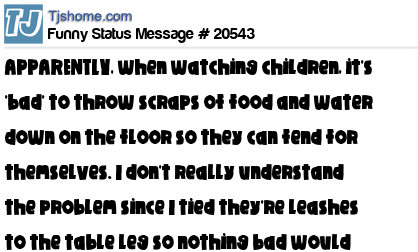 X is APPARENTLY, when watching children, it's 'bad' to throw scraps of food and water down on the floor so they can fend for themselves. I don't really understand the problem since I tied they're leashes to the table leg so nothing bad would happen!!!