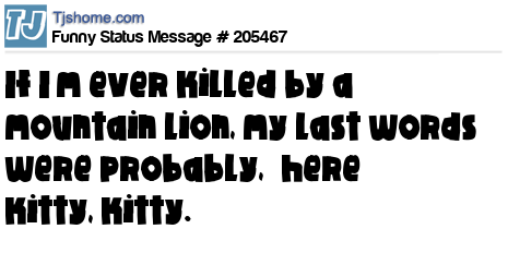 X says If I’m ever killed by a mountain lion, my last words were probably, “here kitty, kitty.”