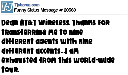 X is Dear AT&T Wireless, Thanks for transferring me to nine different agents with nine different accents...I am exhausted from this world-wide tour.