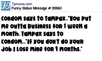 - # 53468 The condom says to the tampon, "You put me out of my job for a week every month!"The tampon replies, "yeah? And when you don't do your damn job properly, I lose mine for 9 months!!"
