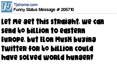 X says Let me get this straight, we can send 40 billion to eastern Europe, but Elon Musk buying Twitter for 40 billion could have solved world hunger?