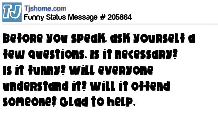 X says Before you speak, ask yourself a few questions. Is it necessary? Is it funny? Will everyone understand it? Will it offend someone? Glad to help.