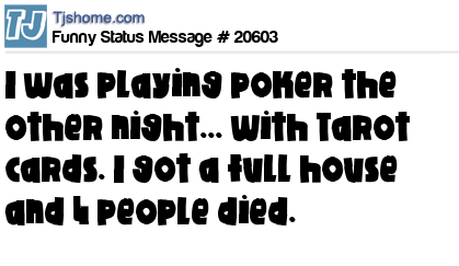 X I was playing poker the other night... with Tarot cards. I got a full house and 4 people died.