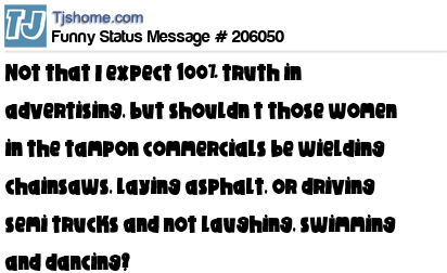 X says Not that I expect 100% truth in advertising, but shouldn’t those women in the tampon commercials be wielding chainsaws, laying asphalt, or driving semi trucks and not laughing, swimming and dancing?