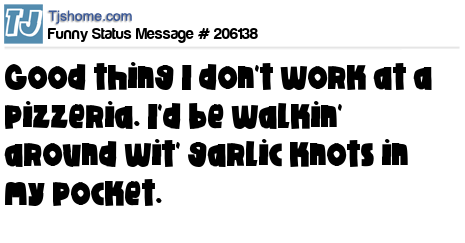 X says Good thing I don't work at a pizzeria. I'd be walkin' around wit' garlic knots in my pocket.