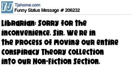 X says Librarian: Sorry for the inconvenience, Sir. We’re in the process of moving our entire Conspiracy Theory Collection into our Non-Fiction Section.