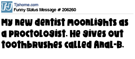 X says My new dentist moonlights as a proctologist. He gives out toothbrushes called Anal-B.