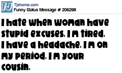 X says I hate when woman have stupid excuses, I’m tired, I have a headache, I’m on my period, I’m your cousin.