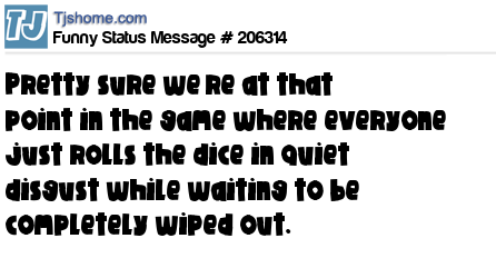 X says Pretty sure we’re at that point in the game where everyone just rolls the dice in quiet disgust while waiting to be completely wiped out.
