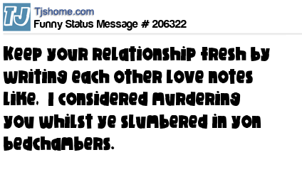 X says Keep your relationship fresh by writing each other love notes like, “I considered murdering you whilst ye slumbered in yon bedchambers.”