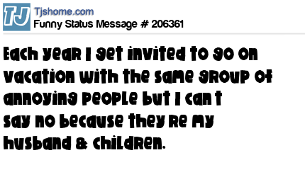 X says Each year I get invited to go on vacation with the same group of annoying people but I can’t say no because they’re my husband & children.