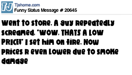 X is Went to store. A guy repeatedly screamed, "WOW, THATS A LOW PRICE!" I set him on fire. Now prices r even lower due to smoke damage