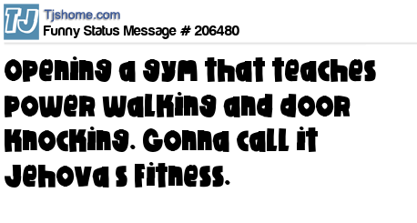 X says Opening a gym that teaches power walking and door knocking. Gonna call it Jehova’s Fitness.