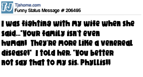 X says I was fighting with my wife when she said..."Your family isn't even human! They're more like a venereal disease!" I told her, "You better not say that to my sis, Phyllis!!