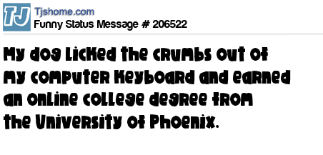 - # 159835 My dog licked the crumbs out of my computer keyboard & earned an online college degree from the University of Phoenix.
