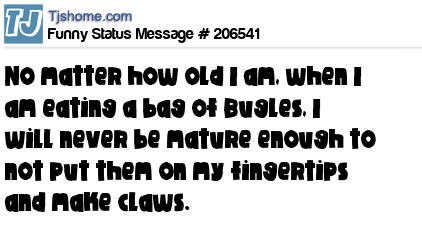 X says No matter how old I am, when I am eating a bag of Bugles, I will never be mature enough to not put them on my fingertips and make claws.
